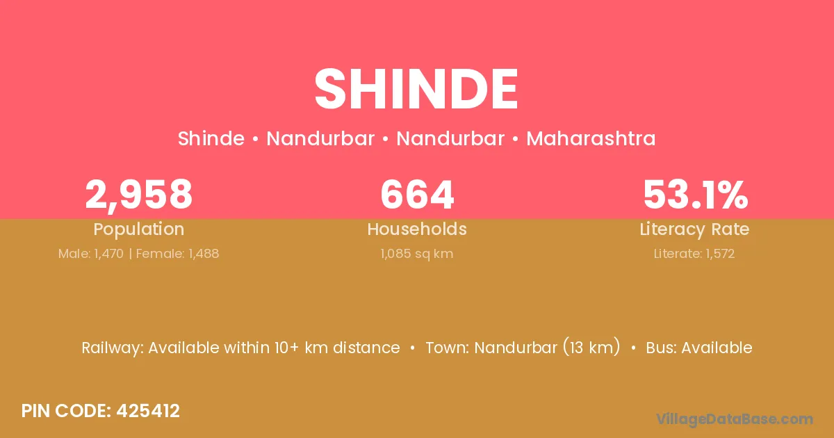 The literacy rate of Shinde village is 59.41%. Male literacy stands at 66.26% and female literacy at 52.17%.