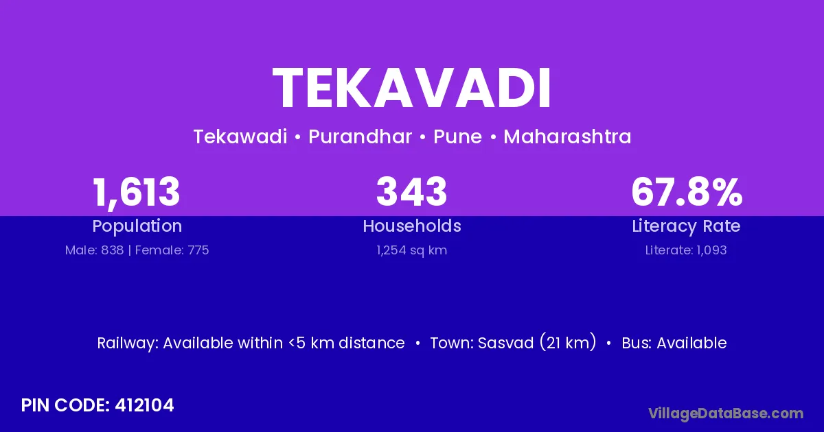 Alandi (59 km) is the nearest town to Tekavadi village for major economic activities and is located approximately 59 km away.
