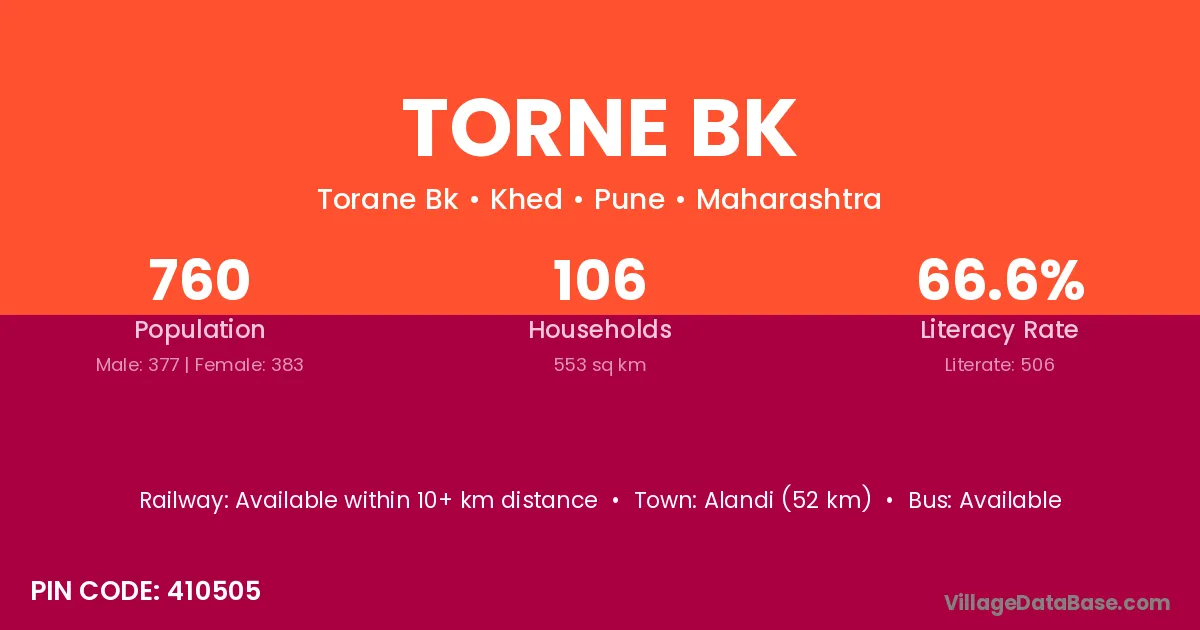 Alandi (52 km) is the nearest town to Torne Bk village for major economic activities and is located approximately 52 km away.