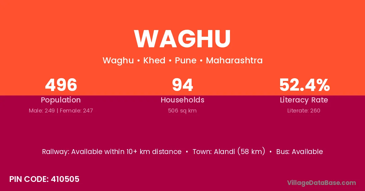 Alandi (58 km) is the nearest town to Waghu village for major economic activities and is located approximately 58 km away.