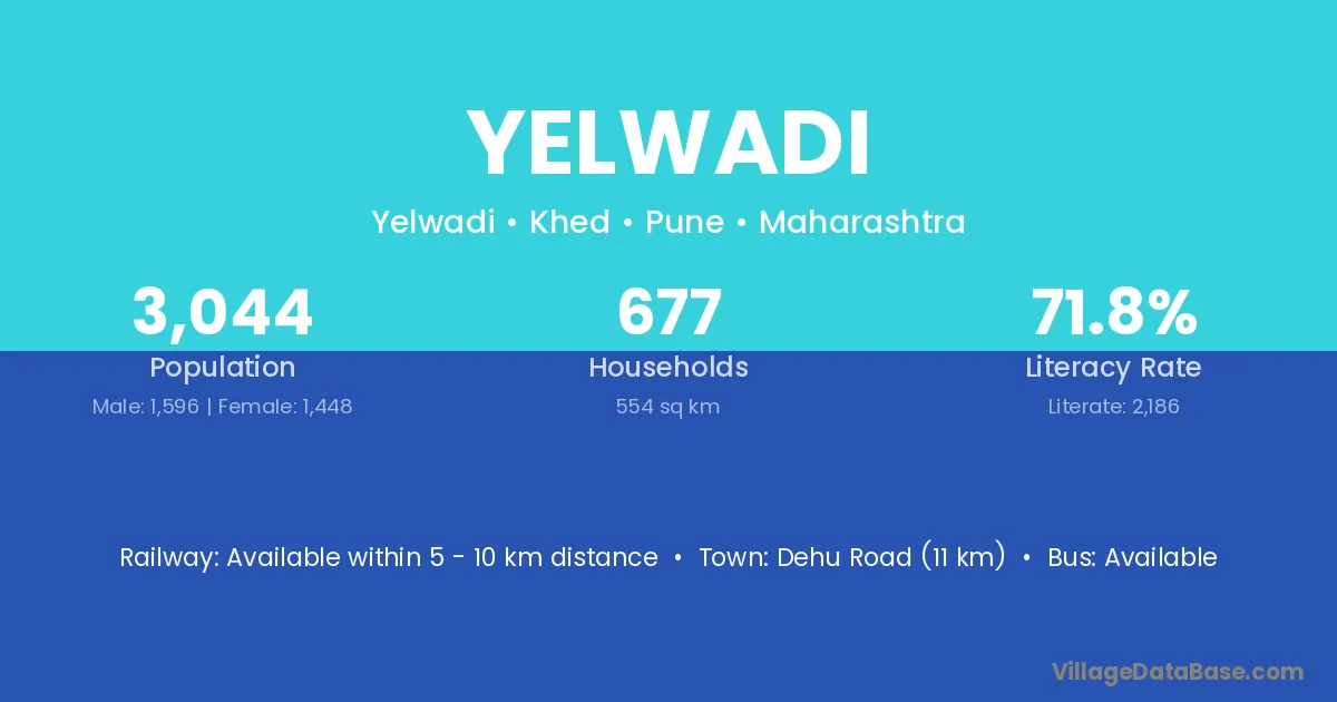 Dehu Road (11 km) is the nearest town to Yelwadi village for major economic activities and is located approximately 11 km away.