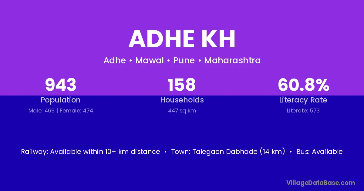 Talegaon Dabhade (14 km) is the nearest town to Adhe Kh village for major economic activities and is located approximately 14 km away.