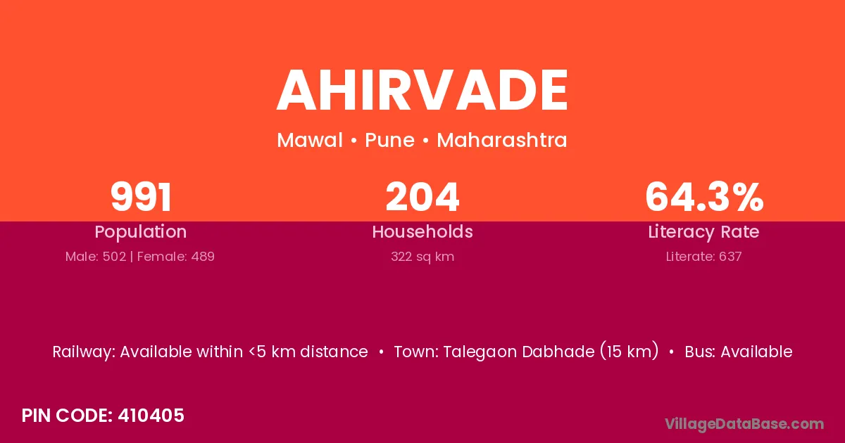 Talegaon Dabhade (15 km) is the nearest town to Ahirvade village for major economic activities and is located approximately 15 km away.