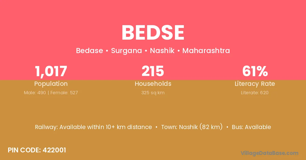 The literacy rate of Bedse village is 59.11%. Male literacy stands at 66.83% and female literacy at 51.28%.