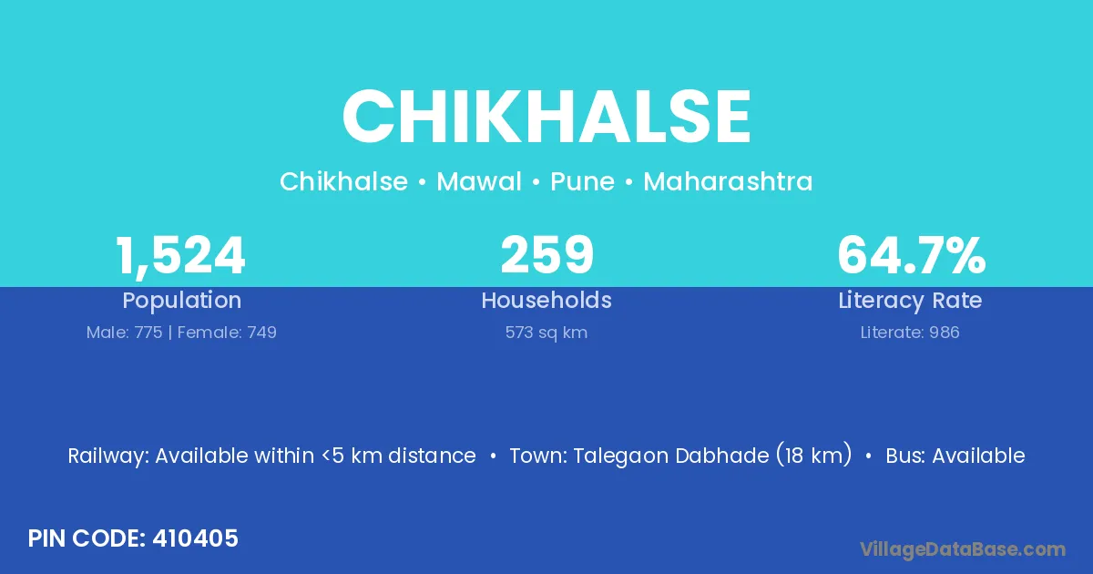 Talegaon Dabhade (18 km) is the nearest town to Chikhalse village for major economic activities and is located approximately 18 km away.