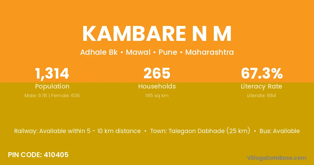 Talegaon Dabhade (25 km) is the nearest town to Kambare N M village for major economic activities and is located approximately 25 km away.