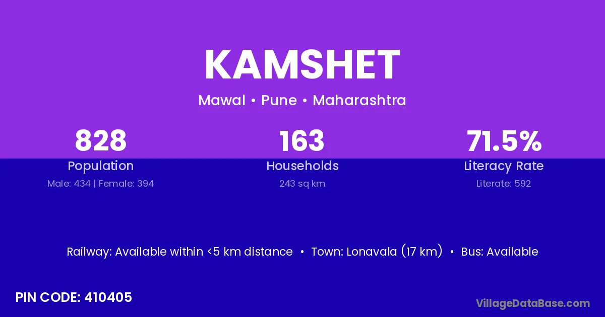 Kamshet village has a total population of 828 people, of which 434 are males and 394 are females.
