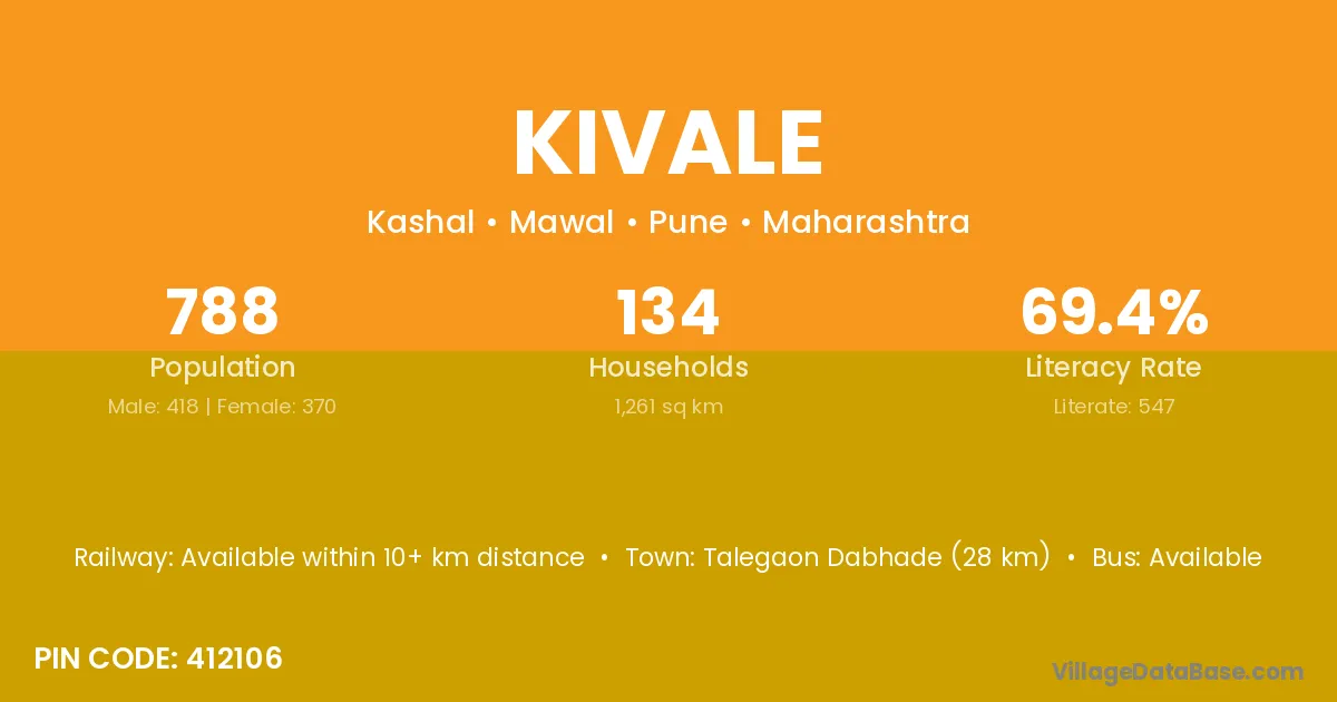 Talegaon Dabhade (28 km) is the nearest town to Kivale village for major economic activities and is located approximately 28 km away.