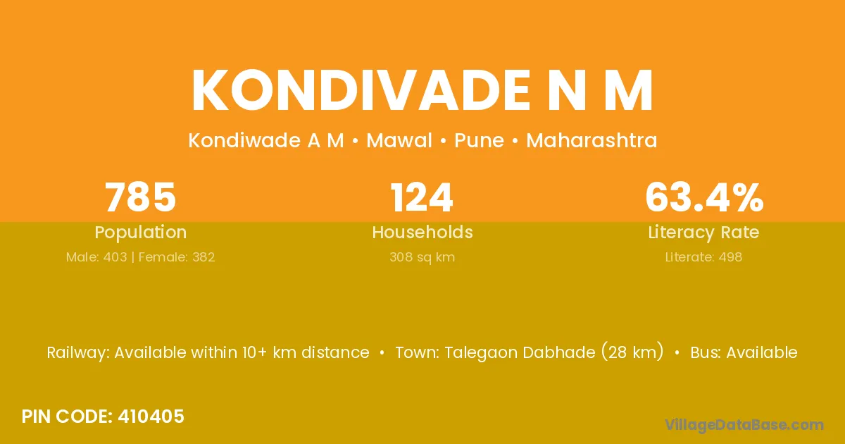 Talegaon Dabhade (28 km) is the nearest town to Kondivade N M village for major economic activities and is located approximately 28 km away.