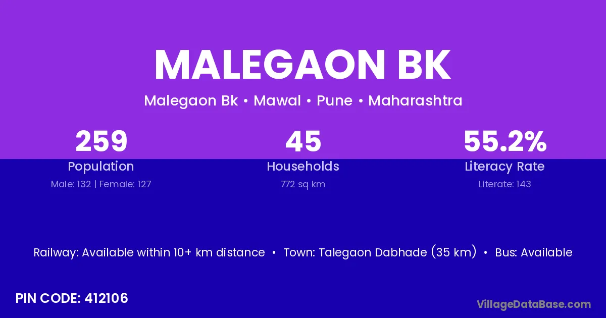 Talegaon Dabhade (35 km) is the nearest town to Malegaon Bk village for major economic activities and is located approximately 35 km away.