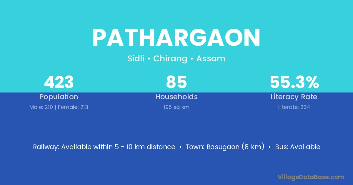 The literacy rate of Pathargaon village is 65.55%. Male literacy stands at 77.78% and female literacy at 52.33%.
