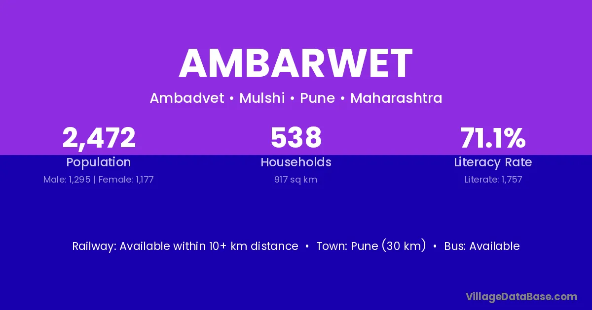 Pune (30 km) is the nearest town to Ambarwet village for major economic activities and is located approximately 30 km away.