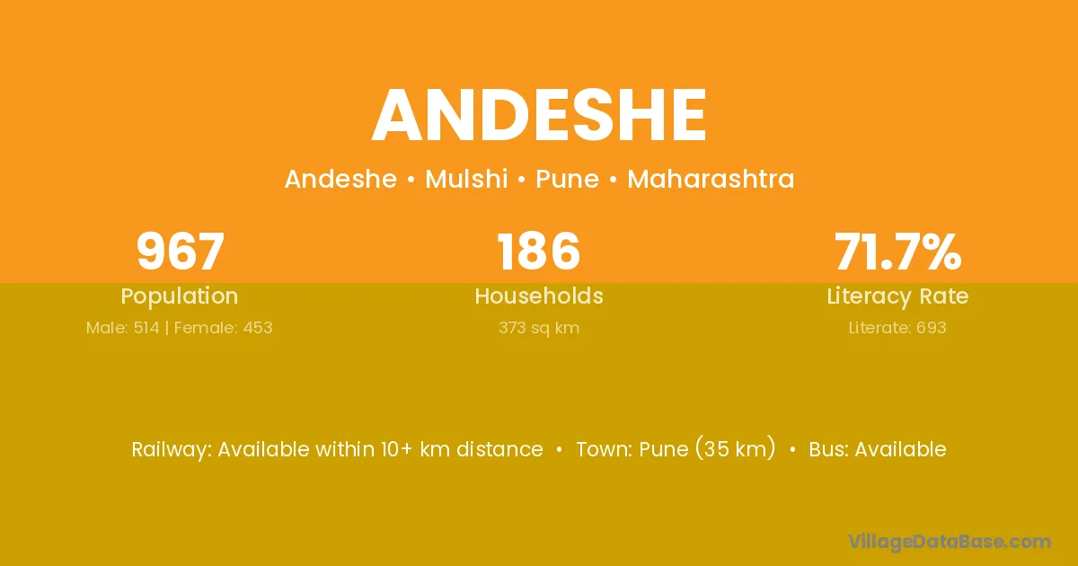 Pune (35 km) is the nearest town to Andeshe village for major economic activities and is located approximately 35 km away.