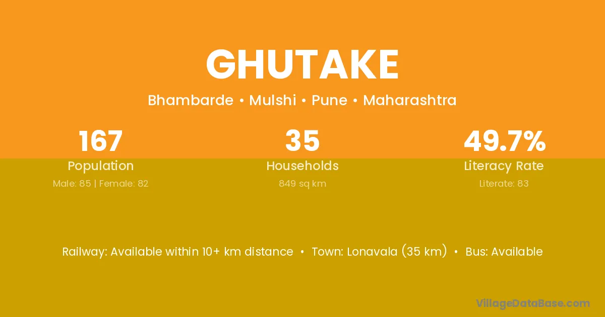 Lonavala (35 km) is the nearest town to Ghutake village for major economic activities and is located approximately 35 km away.