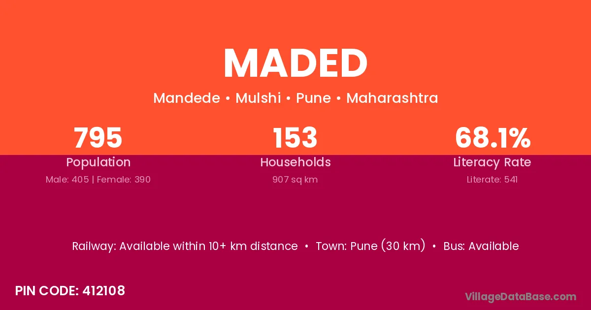 Pune (30 km) is the nearest town to Maded village for major economic activities and is located approximately 30 km away.