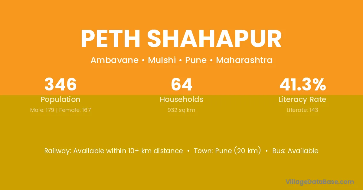 Pune (20 km) is the nearest town to Peth Shahapur village for major economic activities and is located approximately 20 km away.