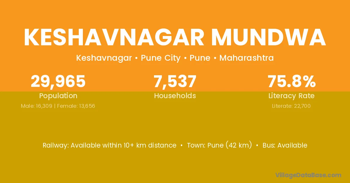 Pune (42 km) is the nearest town to Keshavnagar Mundwa village for major economic activities and is located approximately 42 km away.