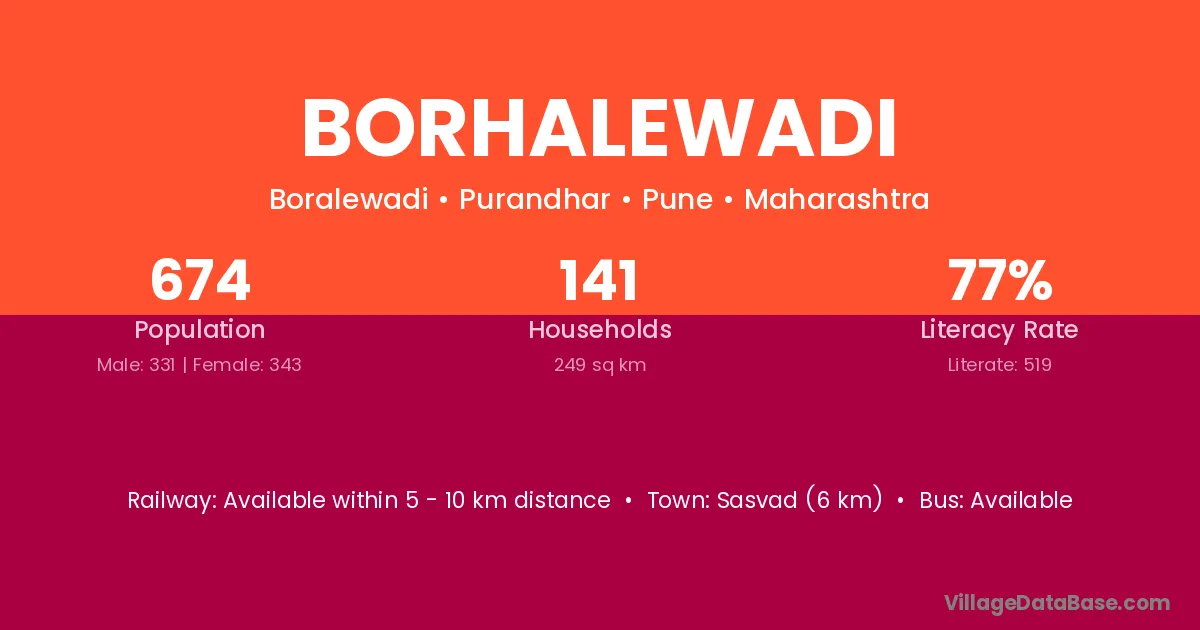 Sasvad (6 km) is the nearest town to Borhalewadi village for major economic activities and is located approximately 6 km away.