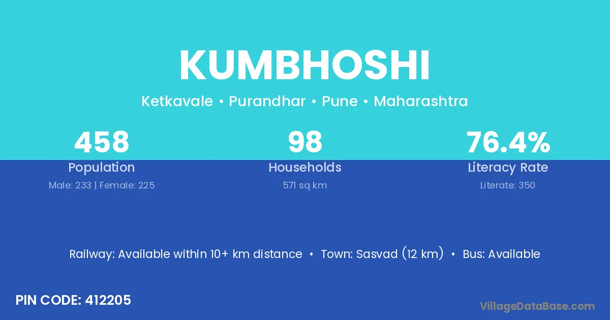 Kumbhoshi village has a total population of 458 people, of which 233 are males and 225 are females.