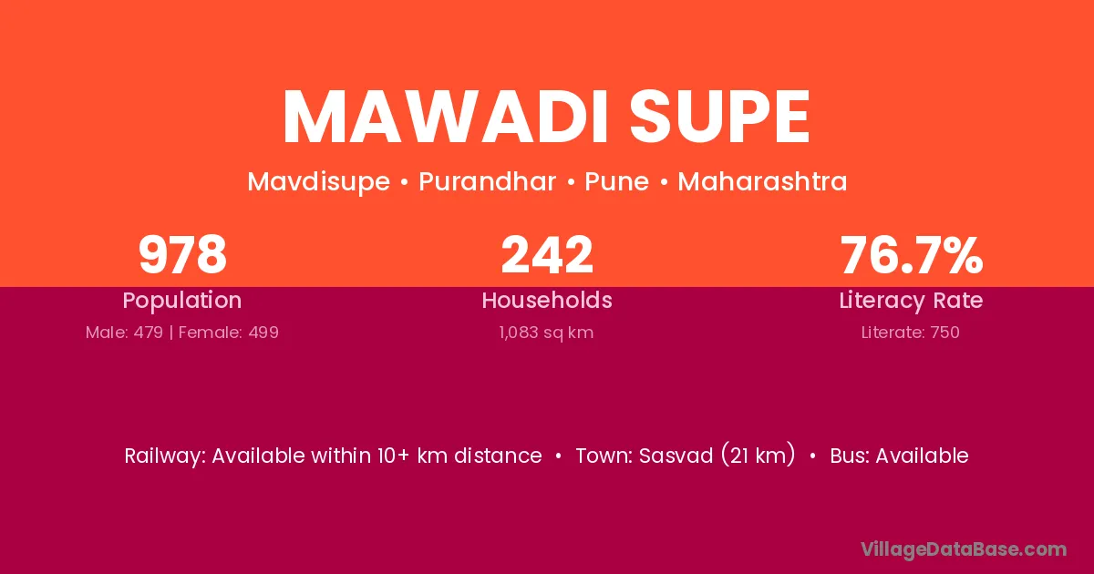 Sasvad (21 km) is the nearest town to Mawadi Supe village for major economic activities and is located approximately 21 km away.