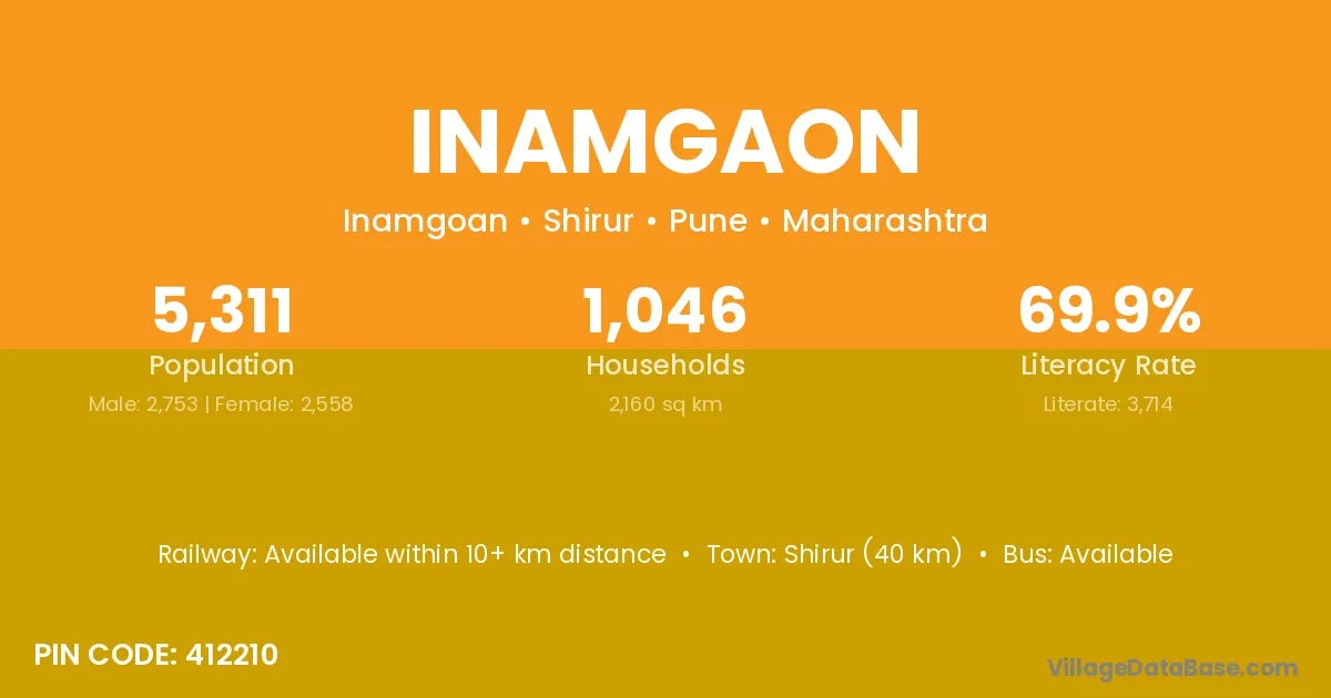 Shirur (40 km) is the nearest town to Inamgaon village for major economic activities and is located approximately 40 km away.