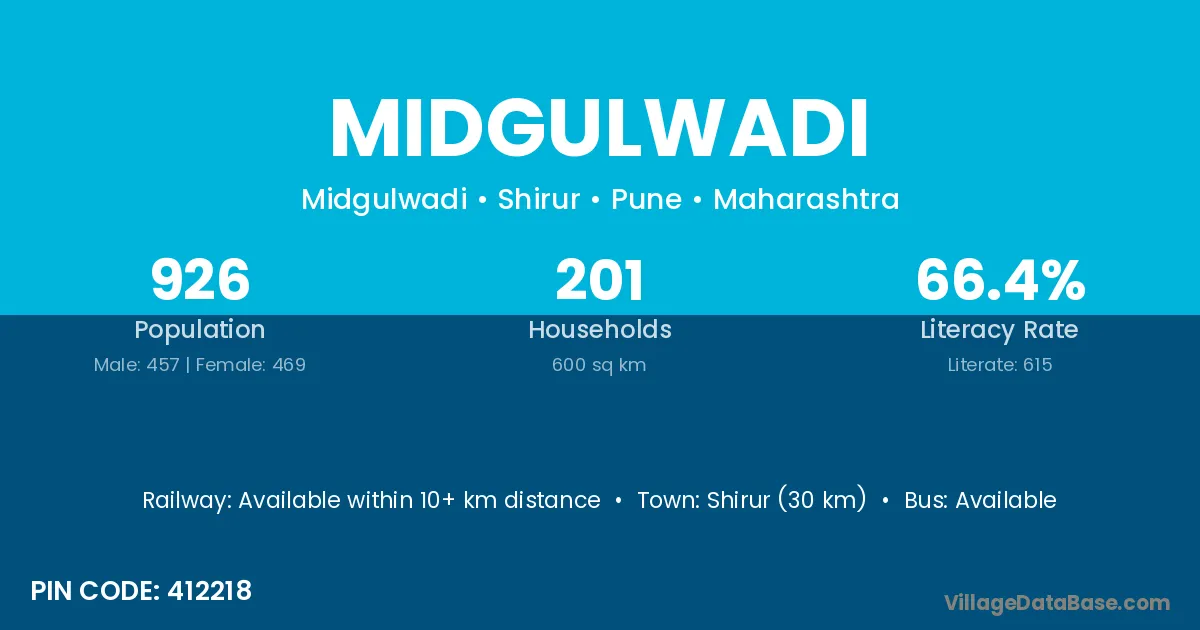 Shirur (30 km) is the nearest town to Midgulwadi village for major economic activities and is located approximately 30 km away.