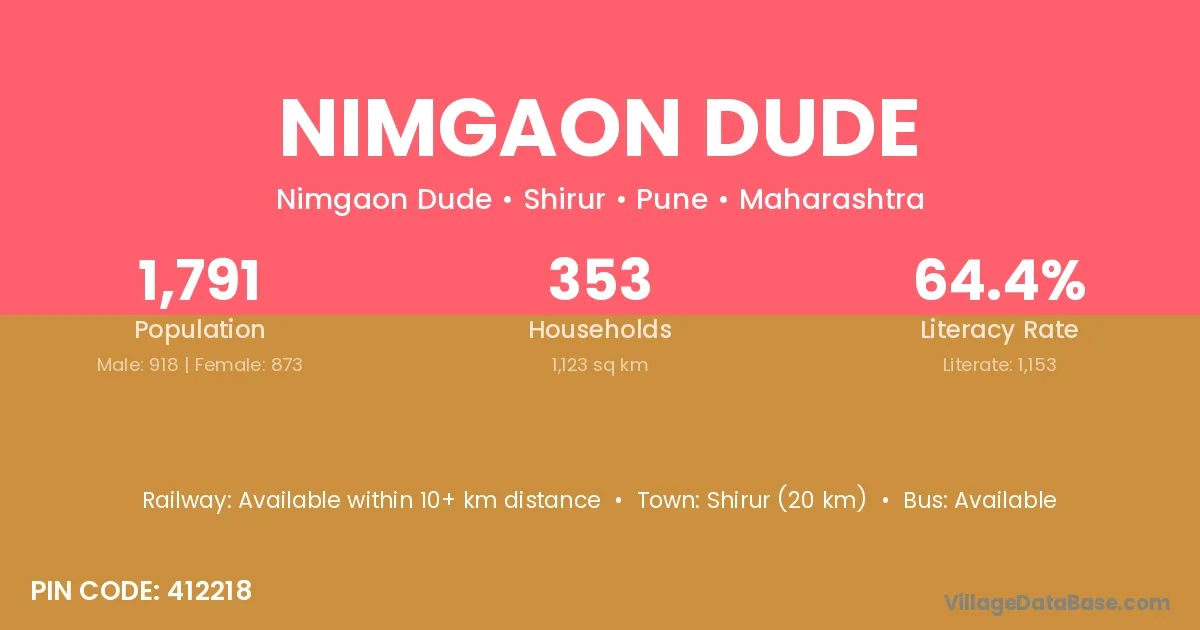Shirur (20 km) is the nearest town to Nimgaon Dude village for major economic activities and is located approximately 20 km away.