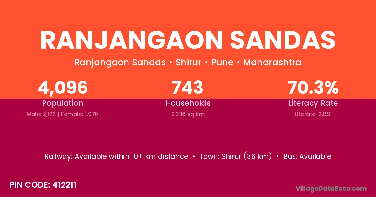 Shirur (36 km) is the nearest town to Ranjangaon Sandas village for major economic activities and is located approximately 36 km away.
