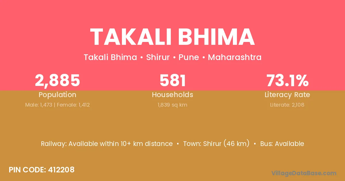 Shirur (46 km) is the nearest town to Takali Bhima village for major economic activities and is located approximately 46 km away.
