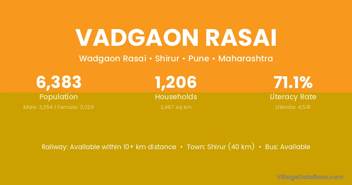 Shirur (40 km) is the nearest town to Vadgaon Rasai village for major economic activities and is located approximately 40 km away.