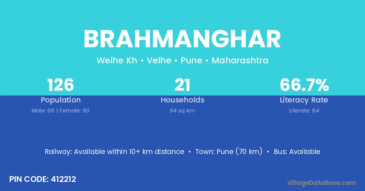 Pune (70 km) is the nearest town to Brahmanghar village for major economic activities and is located approximately 70 km away.