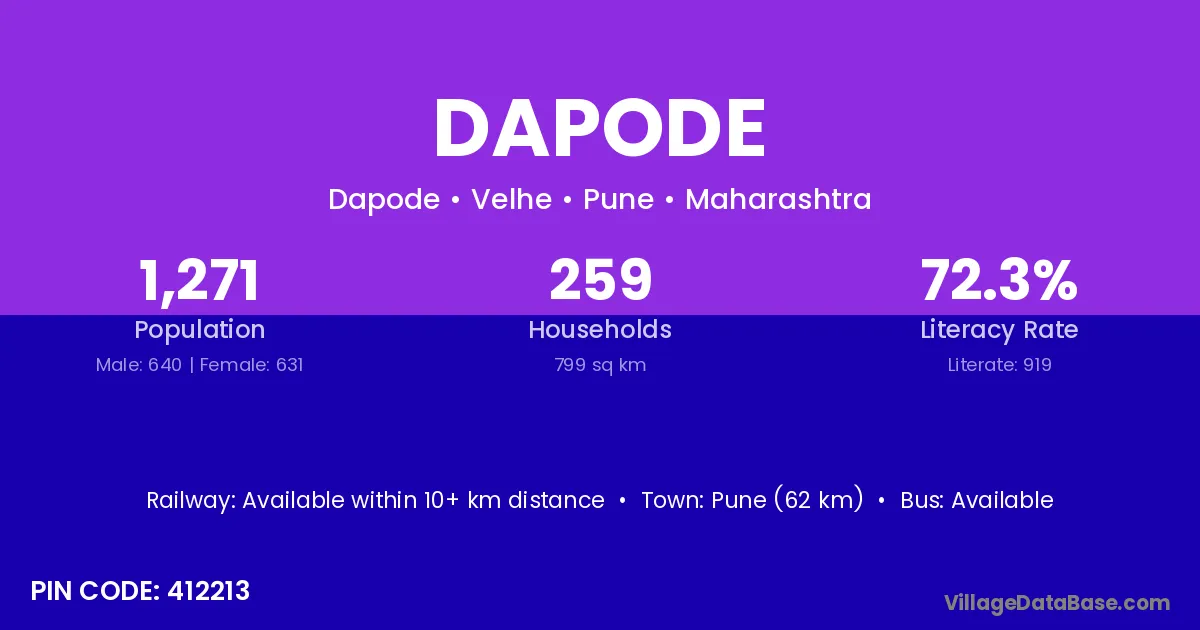 Pune (62 km) is the nearest town to Dapode village for major economic activities and is located approximately 62 km away.
