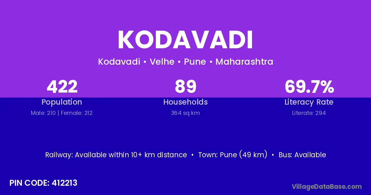Pune (49 km) is the nearest town to Kodavadi village for major economic activities and is located approximately 49 km away.