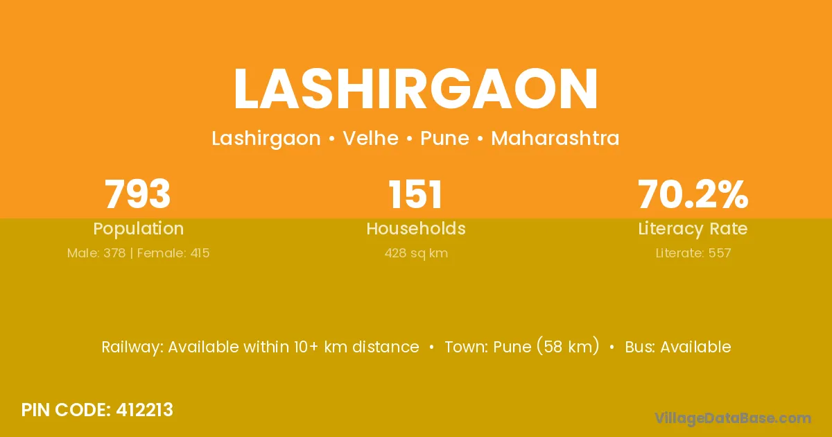 Pune (58 km) is the nearest town to Lashirgaon village for major economic activities and is located approximately 58 km away.