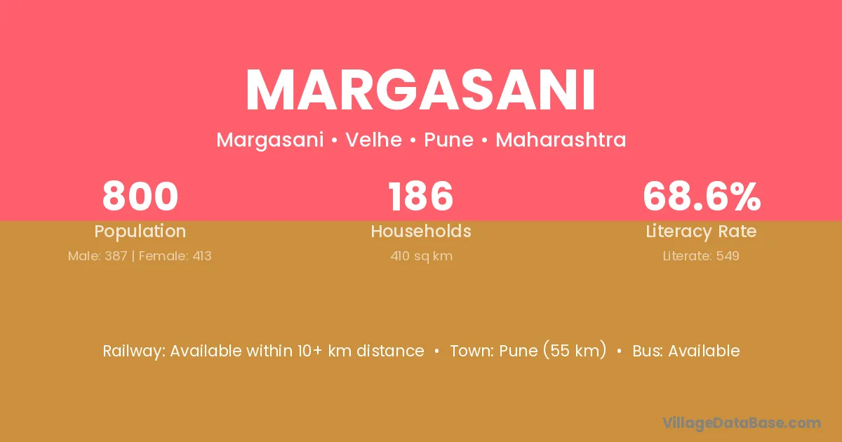 Pune (55 km) is the nearest town to Margasani village for major economic activities and is located approximately 55 km away.
