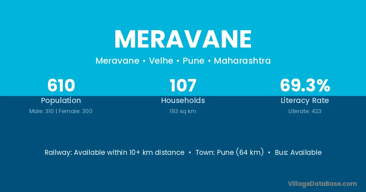 Pune (64 km) is the nearest town to Meravane village for major economic activities and is located approximately 64 km away.