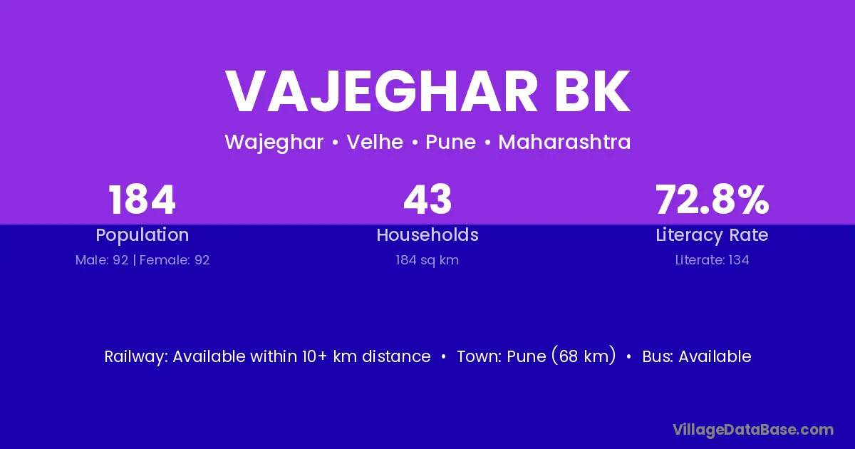 Pune (68 km) is the nearest town to Vajeghar Bk village for major economic activities and is located approximately 68 km away.