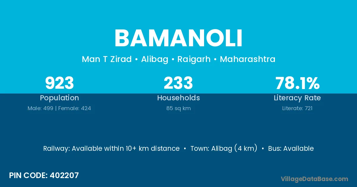 Alibag (4 km) is the nearest town to Bamanoli village for major economic activities and is located approximately 4 km away.