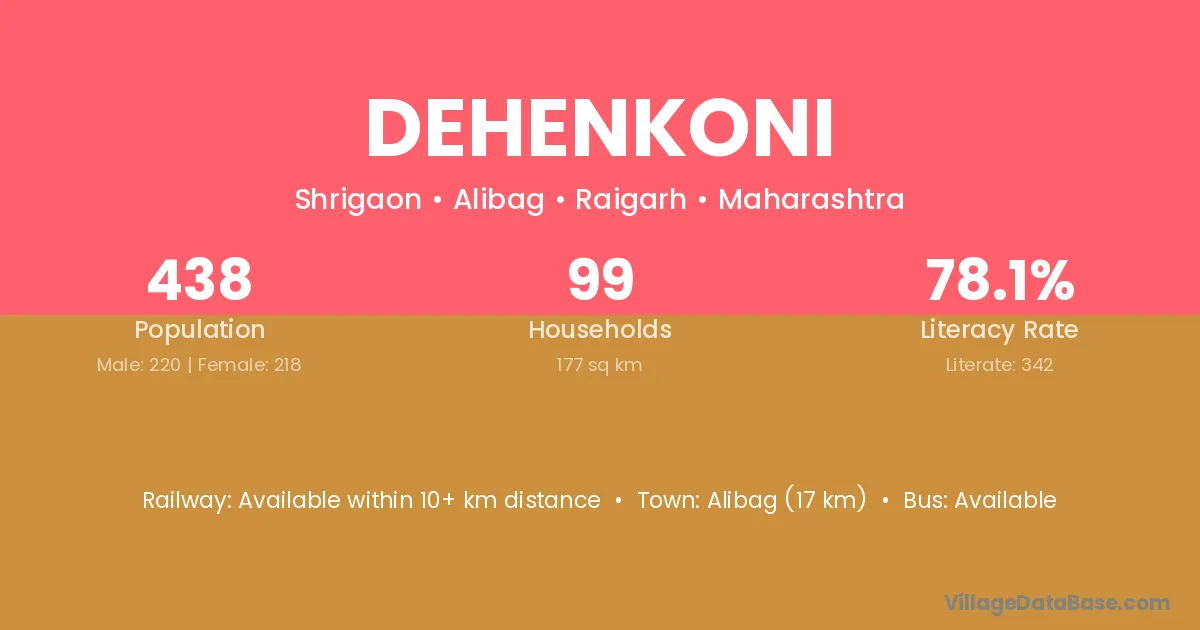 Dehenkoni village has a total population of 438 people, of which 220 are males and 218 are females.