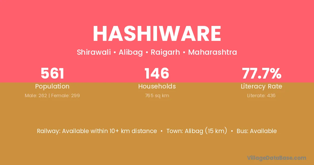 Alibag (15 km) is the nearest town to Hashiware village for major economic activities and is located approximately 15 km away.