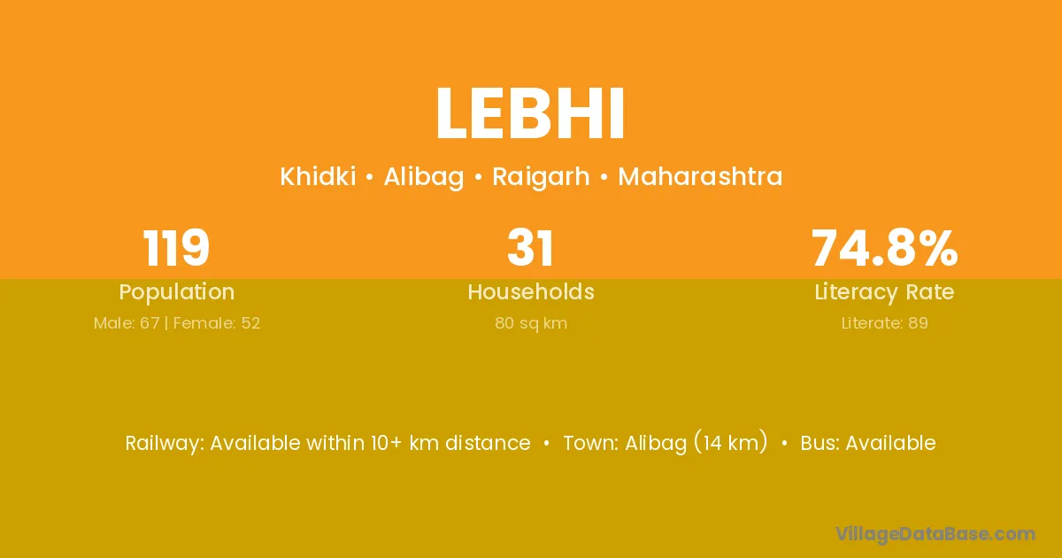 Alibag (14 km) is the nearest town to Lebhi village for major economic activities and is located approximately 14 km away.