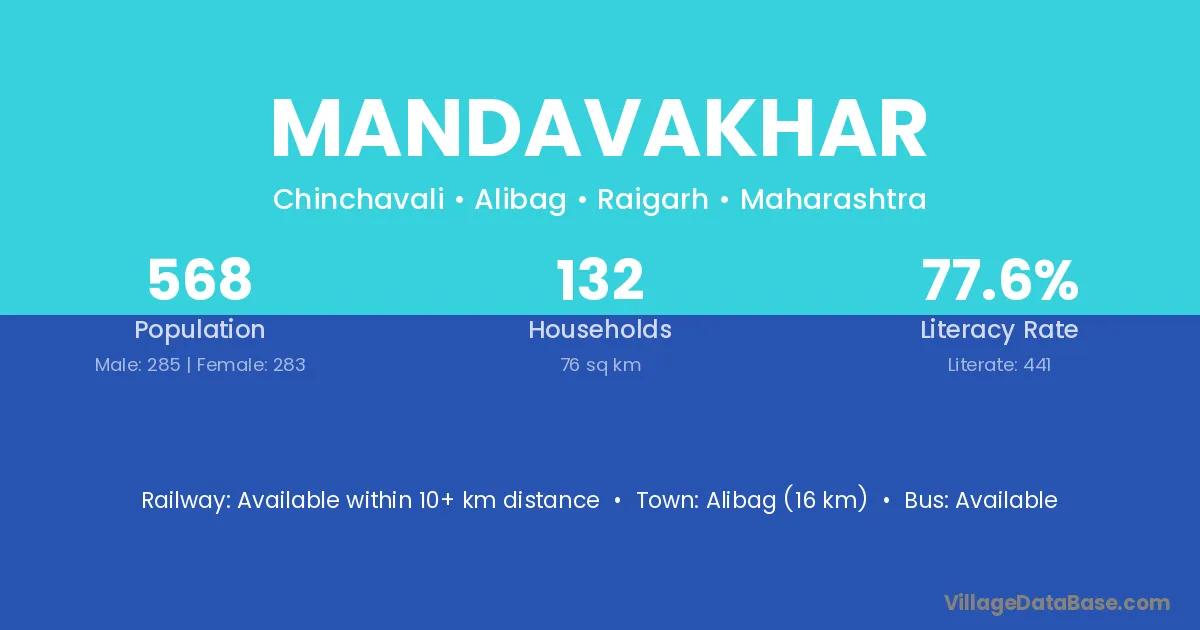 Alibag (16 km) is the nearest town to Mandavakhar village for major economic activities and is located approximately 16 km away.