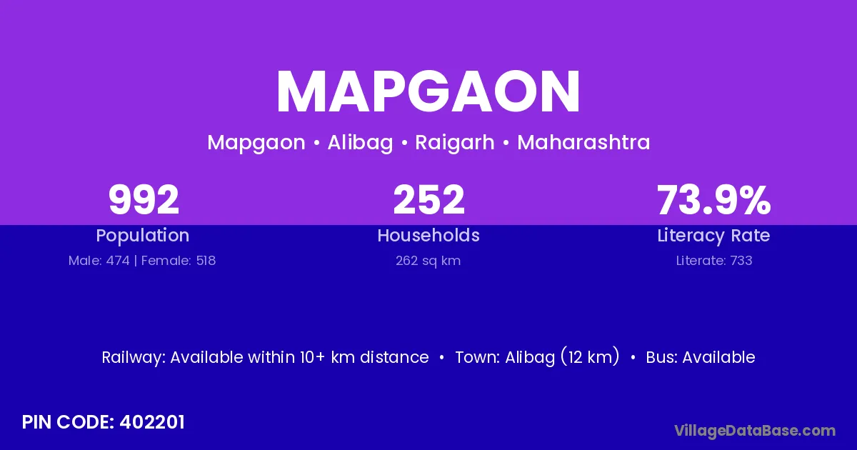 Alibag (12 km) is the nearest town to Mapgaon village for major economic activities and is located approximately 12 km away.