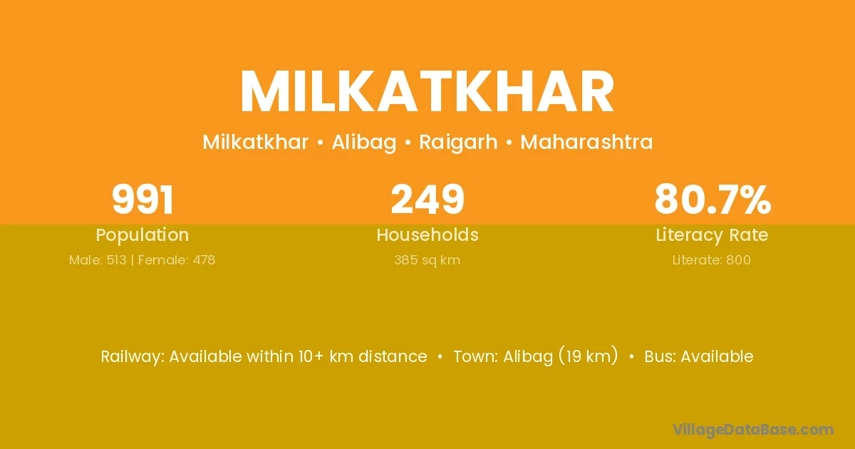 Alibag (19 km) is the nearest town to Milkatkhar village for major economic activities and is located approximately 19 km away.