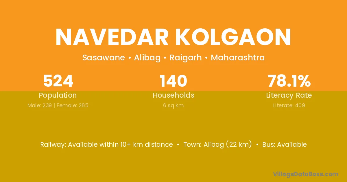 Alibag (22 km) is the nearest town to Navedar Kolgaon village for major economic activities and is located approximately 22 km away.