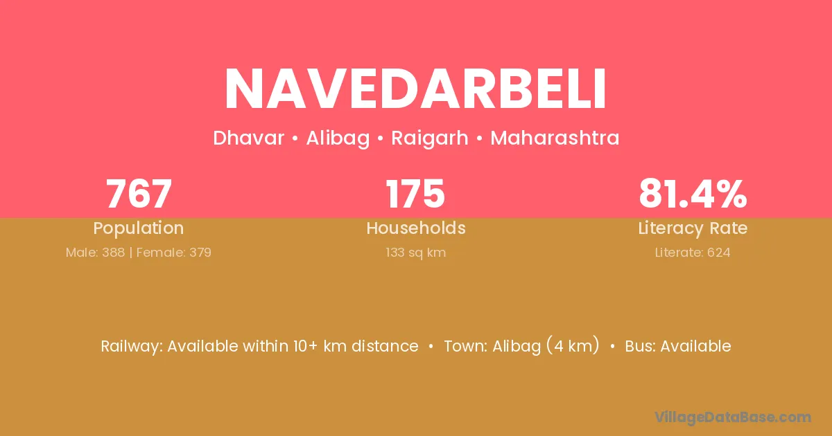 Alibag (4 km) is the nearest town to Navedarbeli village for major economic activities and is located approximately 4 km away.