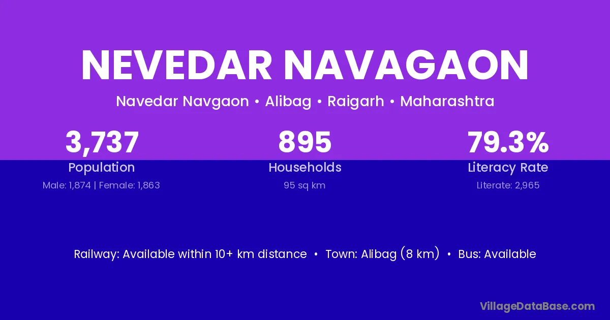 Alibag (8 km) is the nearest town to Nevedar Navagaon village for major economic activities and is located approximately 8 km away.