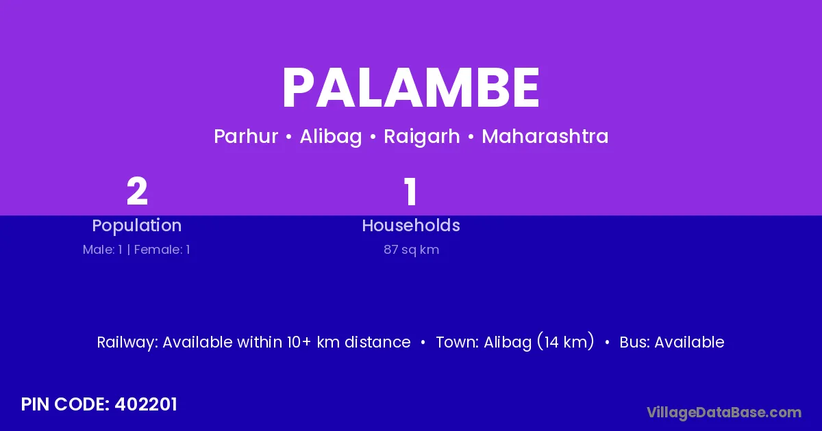 Alibag (14 km) is the nearest town to Palambe village for major economic activities and is located approximately 14 km away.