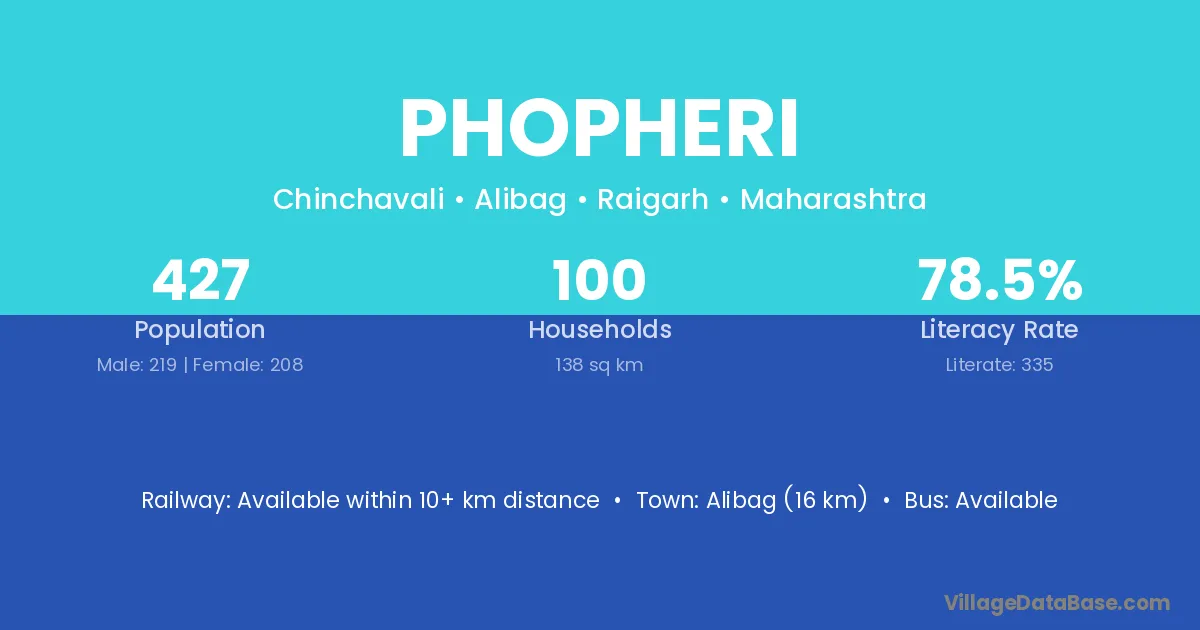 Alibag (16 km) is the nearest town to Phopheri village for major economic activities and is located approximately 16 km away.