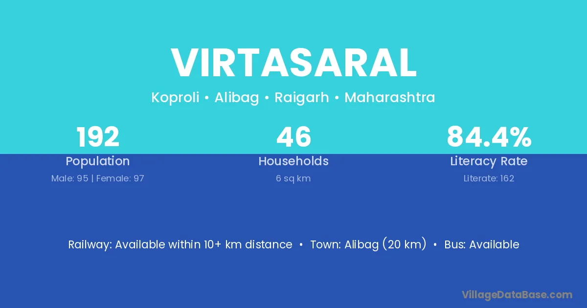 Alibag (20 km) is the nearest town to Virtasaral village for major economic activities and is located approximately 20 km away.